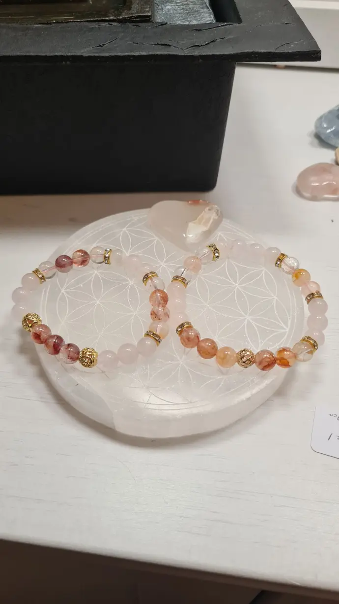 Bracelets en quartz hématoïde et quartz rose 8mm, intercalaires dorées - 16cm (gauche) et 17 cm (droite), ajustables sur demande - 21€ l'unité