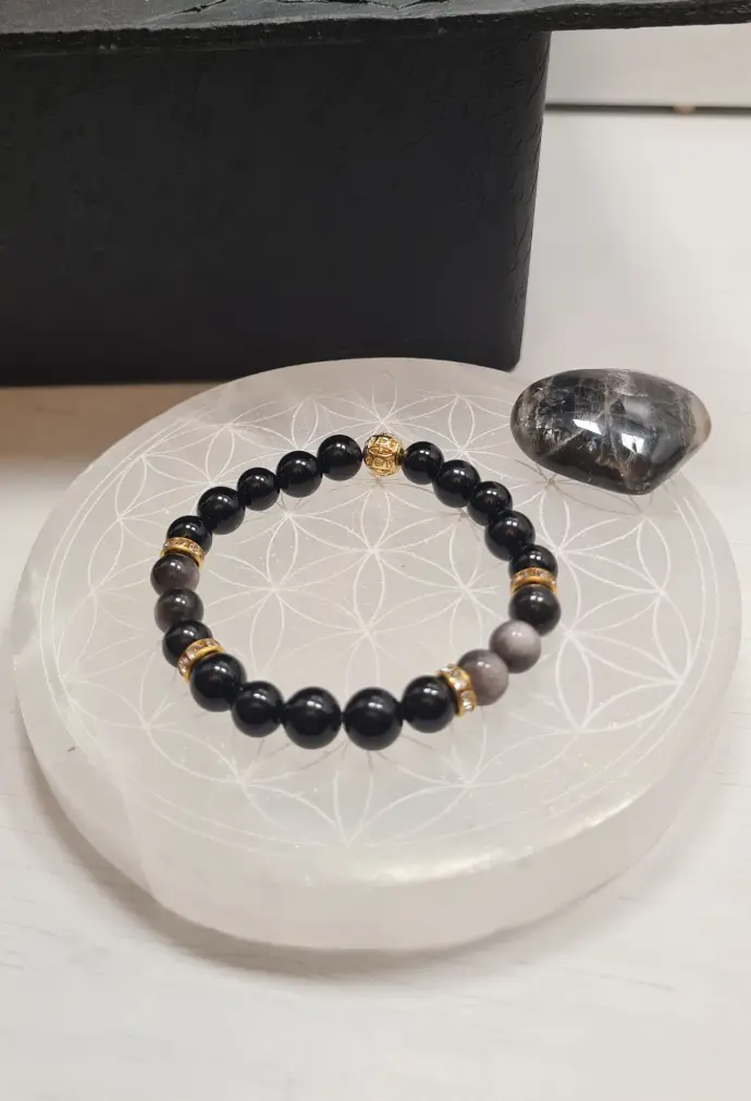 Bracelet en obsidienne noire et obsidienne argentée 8mm, intercalaires dorées - 16cm , ajustable à votre taille sur demande- 17€
